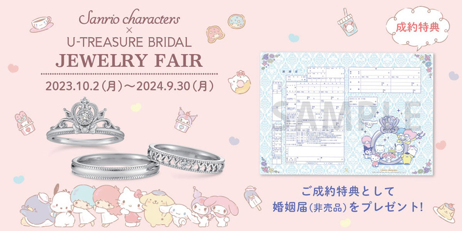 ㈱ユートレジャー (東京都豊島区、 伊藤崇史社長) は、 ㈱サンリオとコラボレーションしたブライダルジュエリーフェアを2023 年 10 月 2 日 (月) から 2024 年 9 月 30 日 (月) までの期間、U-TREASURE オンラインショップ、 U-TREASURE コンセプトストア池袋のほか、 正規販売店で開催する。 婚約指輪または結婚指輪 を成約の方に 「U-TREASURE オリジナル婚姻届」 を成約特典としてご用意した。